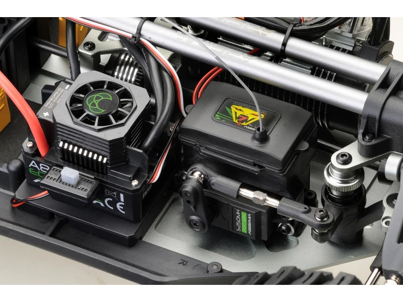 The ESC with its 150A continuous current also has a fan which ensures a perfect operating temperature. The electronics are powered by either two 2S batteries or two 3S batteries with XT90 high current connectors which fit perfectly into the two battery compartments in the rear of the vehicle. Due to the well thought-out distribution of all components, an optimal weight distribution is guaranteed.ย