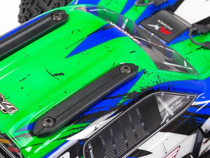The proven tough ARRMAĀ® 4X4 platform lets you bash at high speeds in almost any environment – off-road, on dirt and grass, on parking lots and over paved and asphalt surfaces. Its durability comes from a strong composite chassis featuring extended height dirt defenders, oil-filled shocks with silicone O-rings, metal geared differentials and more. Rugged bumpers and high-traction dBootsĀ® Katar⢠tyres mounted on tough, gun-metal colored wheels add to its unstoppable performance. The VORTEKS⢠4X4 3S BLX also includes a sleek, new stadium truck body with tough, injection-moulded wing and protective roof skids.