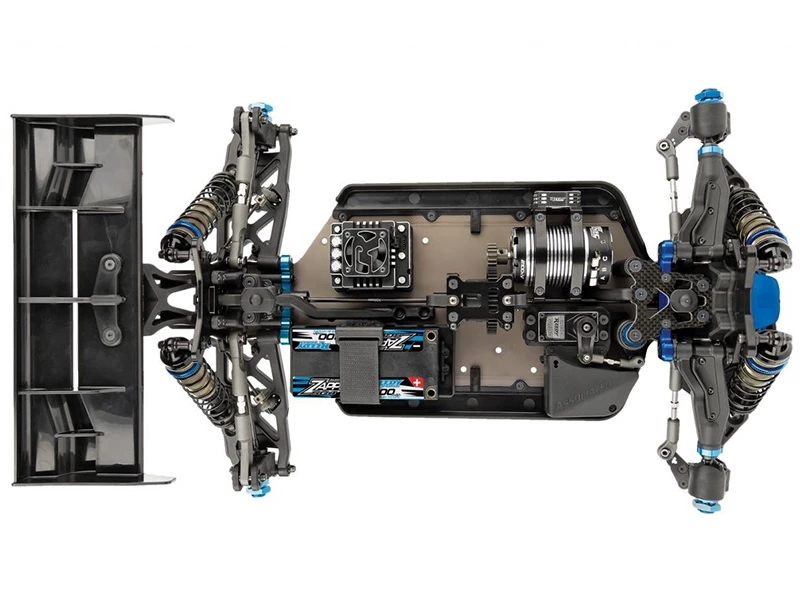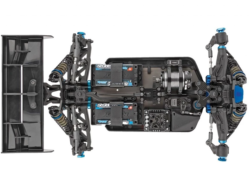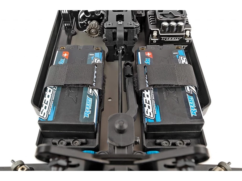 New chassis layout featuring two different shorty-style only battery configurations. Both configurations include a centrally mounted center differential and in-line center dogbones for superior drivetrain efficiency and equalized chassis balance.