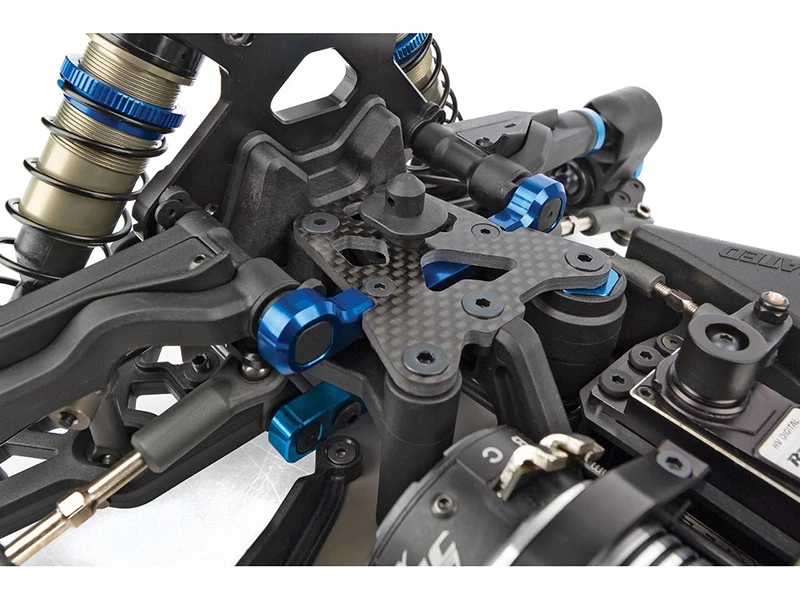 - New RC8B4e specific carbon fiber front top plate with offset front chassis brace