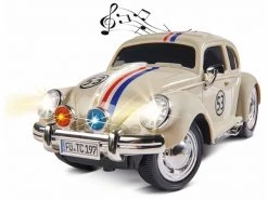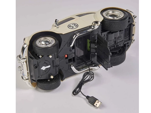 The 1:14 scale VW Beetle Rally cult car, with the starting number 53, captivates with its hot rod design. The complete package is equipped with a remote control system incl. batteries. The battery and USB charging cable are permanently installed in the vehicle, which enables fast charging. You don’t have to search for ages for the right cable and the Beetle is quickly ready to go again. With its long, 45 min. driving time and transmitter range of up to 50 m, it offers pure driving pleasure, which is topped off by the various sounds that can be switched on, the two LED front lights and the additional flashing lights.