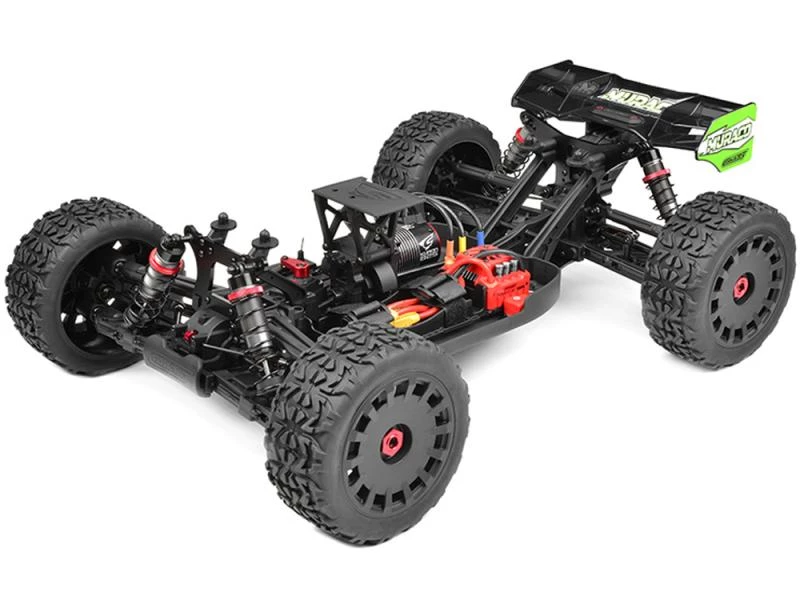 As usually seen only on premium competition-level RC vehicles, the Muraco is fitted with front, center, and rear silicone fluid-filled and sealed limited-slip differentials that ensure the full amount of power from the 2050KV Kuron motor gets to the ground. With easy removal and maintenance, you can even alter each differential individually to fine-tune the amount of traction at either end of the truggy! Inside, you’ll find a complete set of metal gears and outdrive cups that connect to steel central driveshafts. The front end is driven by CVD driveshafts, while the rear is driven by robust metal dogbones, with the entire drivetrain supported by aerospace-quality 8x16x5mm rubber sealed ball bearings for maximum efficiency and durability.