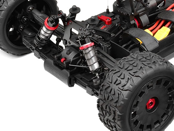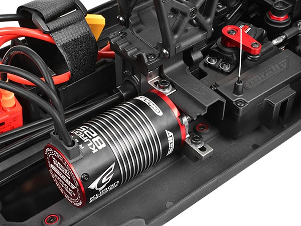 With a Team Corally Kuron 2050KV 4-pole motor mounted on a torsion-resistant aluminium 2-piece sliding mount, you can be confident of attaining maximum speeds for big-air stunts! The motor is fitted with a hardened steel pinion gear, which mates to a hardened steel spur gear on the center differential.