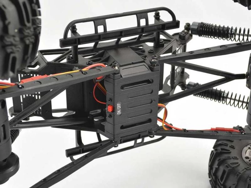 Inspired by full sized caged crawlers, the Ravine features and M.O.A. (motor over axle) design for a lower centre of gravity and more control front and rear. In addition the Ravine’s is fitted with steering servos both front and rear for a full array of different steering options. These steer-ing options can be easily switched while on the move via the transmitter providing you with instant help when navigating the trail. Stuck in a tight spot? Switch to the 4-Wheel-steering option for a tighter turning circle at low speed or at high speed or on softer surfaces change direction with the crab model. The options are limitless for you to explore all kinds of terrain with the Ravine.