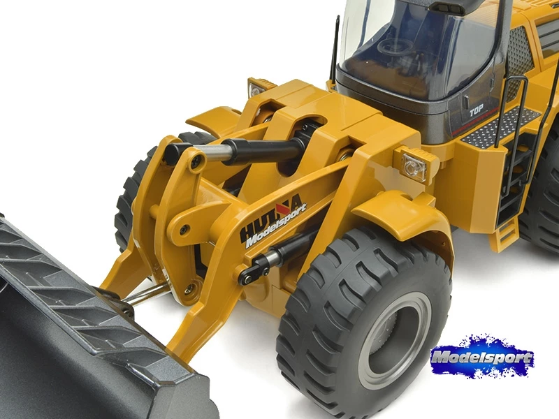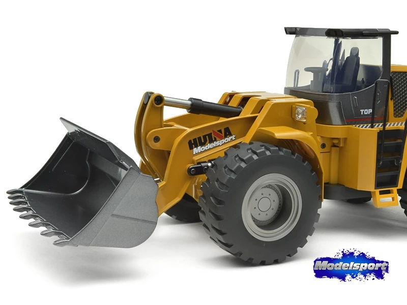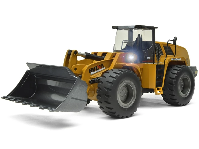 The Huina 1583 Wheeled Loader is a 10 channel, die cast metal RC bulldozer. The bucket loader can move forward, backward, turn left, turn right, 360 degrees rotary. With sound and lights and each joint can be independently controlled.