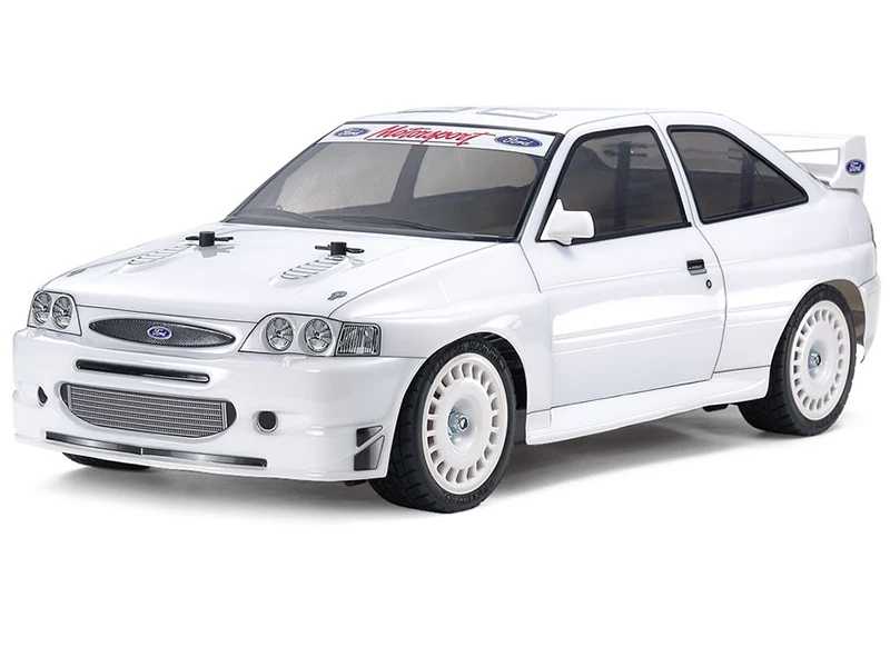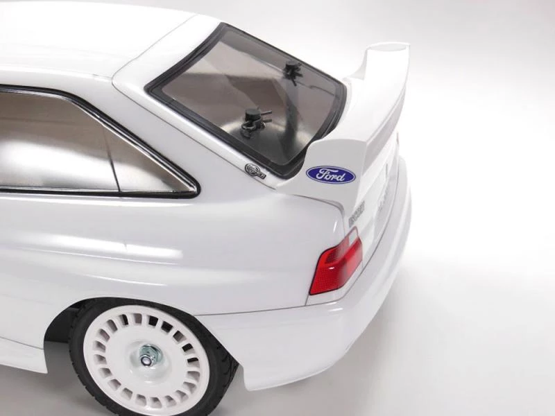 This R/C model assembly kit recreates a 3-door hatchback Ford Escort Mk.6 with customizations such as blister fenders, front spoiler and rear wing. The powerful form is captured by a polycarbonate body which is based on the efficient shaft-driven 4WD of the TT-02 chassis.