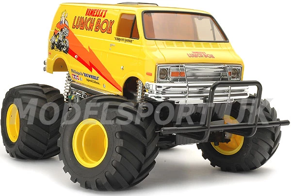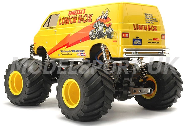 Another Tamiya classic creation, the R/C Lunch Box (1st released, 1987) was loved for its appearance as much as for its R/C performance. The boxy minivan body raised up over monster truck wheels ensure that this R/C van will get attention anywhere you choose to drive it. Use the sides of the van as a canvas to paint your own original designs for the ultimate conversation piece!