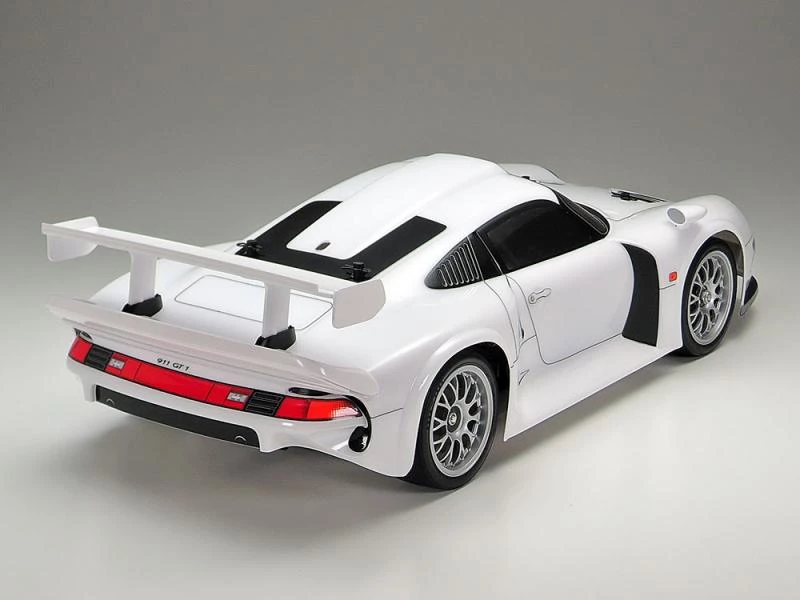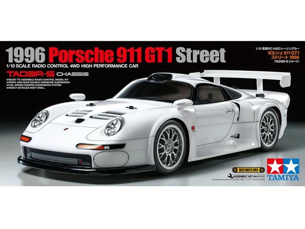 The 1997 911 GT1 race car is a classic R/C model in the Tamiya catalog of assembly kits. Originally released as the Le Mans race car replica, this kit recreates the “street legal” car that was released for homologation purposes. This replica returns on the TA03R-S chassis, which is a short wheelbase variant of Tamiya’s highly successful and fun TA-03 4WD touring car. The actual car debuted in 1996, and was a “street” car with an extremely strong racing heritage – powered by a 3.1-liter inline-six rear-mid engine generating nearly 600hp, it was said to reach speeds of up to 330km/h. The racecar took second and third in Le Mans in 1996, and went one better with a 1-2 finish in 1998.