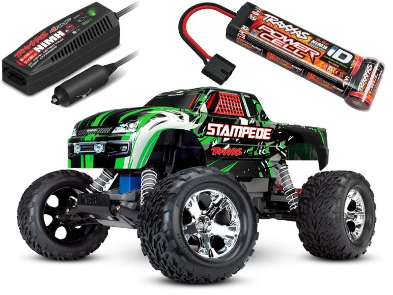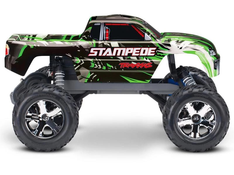 The best-selling Traxxas Stampede is the original high performance monster truck. Its legendary ruggedness has made the Stampede name synonymous with off-road fun. Today, the Stampede has a bold look, innovative features, and of course, more power. With a top speed of 30+mph and a tall drive-over-anything ground clearance, Stampede rips through grass and powers over curbs. Waterproof electronics allow it to blast through puddles and shred snow for all-weather adventure. Step up to genuine Traxxas quality and performance and discover a whole new level of fun with the Traxxas Stampede!