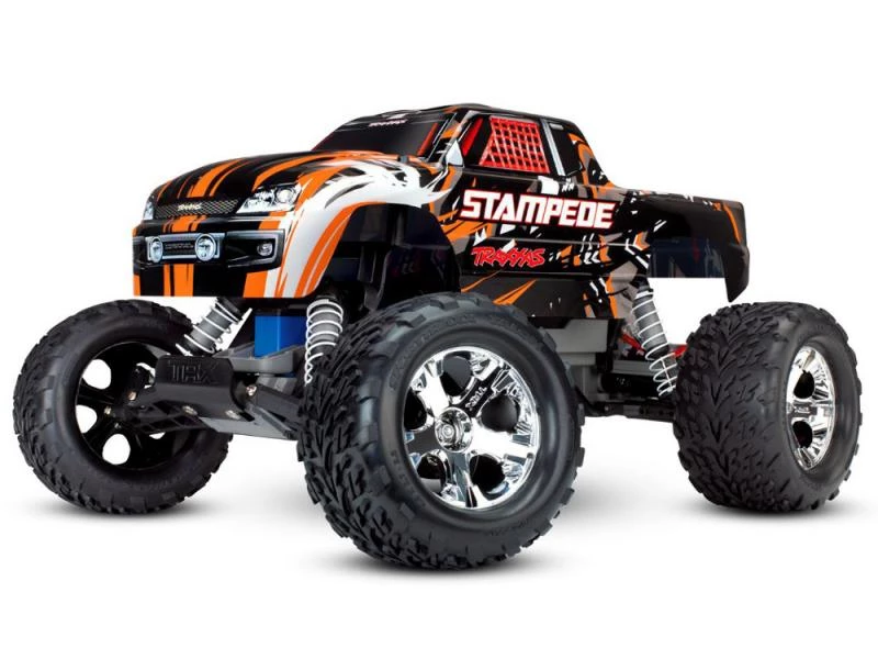 The best-selling Traxxas Stampede is the original high performance monster truck. Its legendary ruggedness has made the Stampede name synonymous with off-road fun. Today, the Stampede has a bold look, innovative features, and of course, more power. With a top speed of 30+mph and a tall drive-over-anything ground clearance, Stampede rips through grass and powers over curbs. Waterproof electronics allow it to blast through puddles and shred snow for all-weather adventure. Step up to genuine Traxxas quality and performance and discover a whole new level of fun with the Traxxas Stampede!