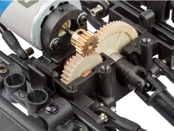 - 15:98:1 Ratio 3-gear transmission with integrated motor mount